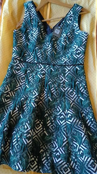 Precioso vestido de la marca Oasis, talla 14/40, en tonos verdes y blancos. Es un vestido skater, con un diseño elegante y llamativo. - Diseño skater - Estampado de hojas tropicales - Cierre de cremallera invisible en la espalda - Forro interior