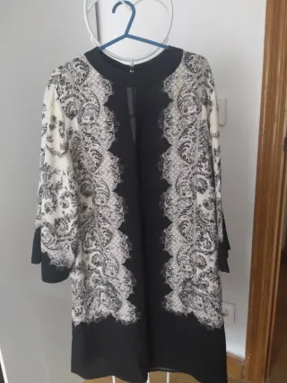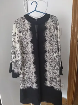 Precioso vestido corto, ideal para ocasiones especiales. Es de color blanco y negro con estampado floral. - Diseño elegante y favorecedor. - Sin mangas. - Tejido ligero y agradable al tacto. - Perfecto estado. Usado una vez. - La talla dice 42, pero yo llevo una L.