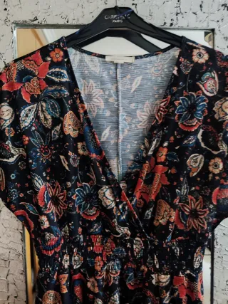 Vestido de manga larga con un bonito estampado floral, perfecto para la temporada de otoño. - Diseño con cuello redondo. - Estampado detallado con flores y hojas. - Corte recto y cómodo. Está nuevo, sin estrenar, con su etiqueta. Precio de tienda 44,95 e. y hago el 50% DE DESCUENTO y lo dejo en 22,50 e. por ser de mi tienda que acabo de cerrar.