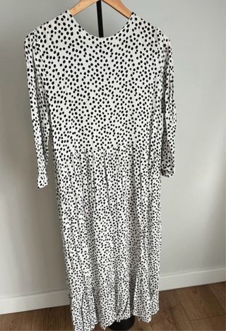 Vestido largo de Massimo Dutti con estampado de lunares. - Diseño sin mangas. - Cuello en V. - Cierre de botones en la parte delantera. - Cintura ajustable con cordón.