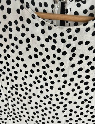 Vestido de tirantes con un llamativo estampado geométrico en blanco y negro. El diseño presenta un escote en V y una silueta fluida que cae con gracia. - Diseño sin mangas. - Tejido ligero con estampado de cuadros y líneas. Fotos con medidas Aunque la etiqueta pone 42 yo creo que es una M o L