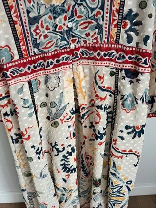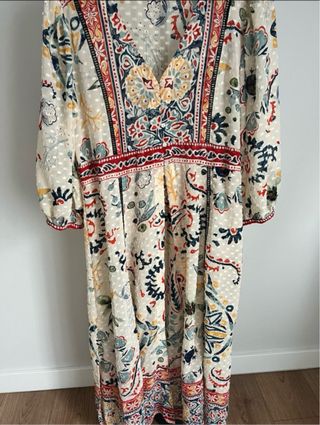 Vestido largo estilo boho de Zara con un bonito estampado. - Diseño con escote en V. - Mangas largas acampanadas. - Volantes en el bajo.