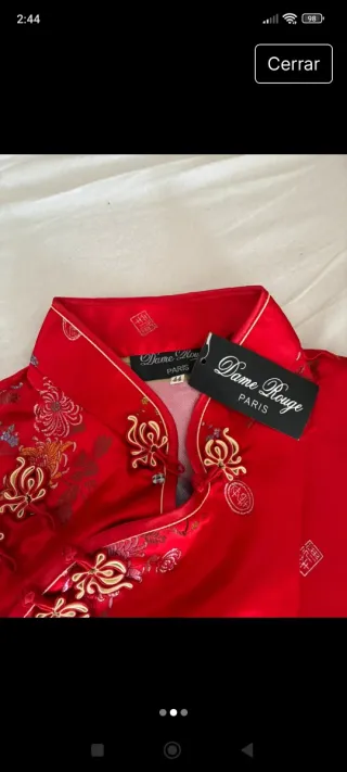 Vestido de estilo oriental con un diseño llamativo. - Estampado floral y motivos tradicionales. - Cuello mao. - Manga corta. - Cierre lateral con botones. - Tejido satinado. Pone xxl pero le quedaria bien a alguien a partir de talla M