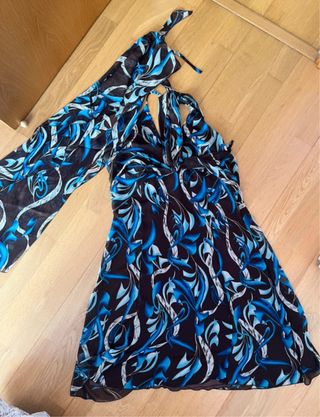 Pack de 2 vestidos: - 1⁰ marca Surkana estampado con cintura, cuello y botones negro. - 2⁰ Asos, azul turquesa, corte skater con mangas acampanadas y espalda semi descubierta. Un único día de uso.
