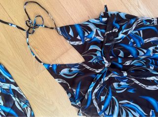 Vestidos de fiesta en azul, tela estampada, talla 36-38 . Solo puesto para hacer las fotos. Lleva un lazo en la parte del hombro derecho, y un poco de cola. Abertura en la parte delantera. Medidas : Pecho: 82 cm Cintura: 70 cm Largo falda: 118cm