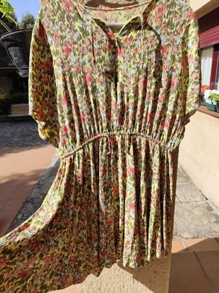 Precioso vestido ligero, ideal para primavera-verano. - Escote redondo. - Sin mangas. - Detalle de vivo negro en los laterales. - Estampado floral en azul y blanco. Se ha puesto bastante así que tiene señales de uso como pequeño desperfecto en un lateral y una mini mancha como se ve en las fotos. Pero es muy util y cómoda para poner en verano, para ir a la piscina o estar por casa.