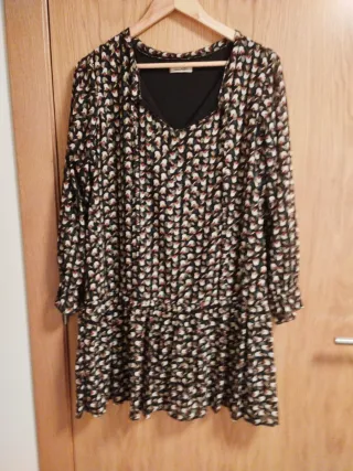 Precioso vestido midi con un diseño elegante y favorecedor. La tela cae con mucha fluidez y el estampado es muy original. - En una de las partes lleva una manga larga con puño ancho y abrochado con bonitos botones. - La otra parte es sin manga y lleva una pieza al estilo túnica que cae hasta el final del vestido. - Escote por delante en pico y por la espalda dos tiras que abrochan en el cuello, dejando parte de la espalda al descubierto. - El vestido marca talla M, pero puede ser L y XL por su forma. - Las medidas están en las ultimas fotos. - Escote en pico. - Manga larga. - Diseño asimétrico. - Corte midi.