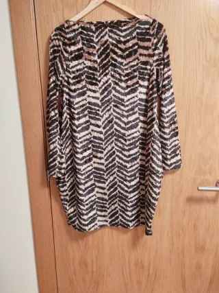 Vestido negro con estampado. Tela fluida, con forro interior. Largura por el muslo. De zara, talla XS, pero es muy amplio