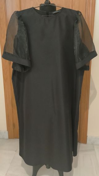 Nuevo a estrenar con etiquetas. Talla S. Elegante vestido negro, ideal para eventos especiales. - Diseño estilo Midi sin mangas. - Cuerpo con detalle de tejido texturizado. - Cintura marcada. - Cremallera dorada a la espalda. - Falda con semi vuelo y estampado de rayas con transparencias. No hago envíos, recoger por mi zona.