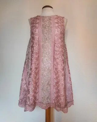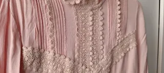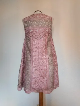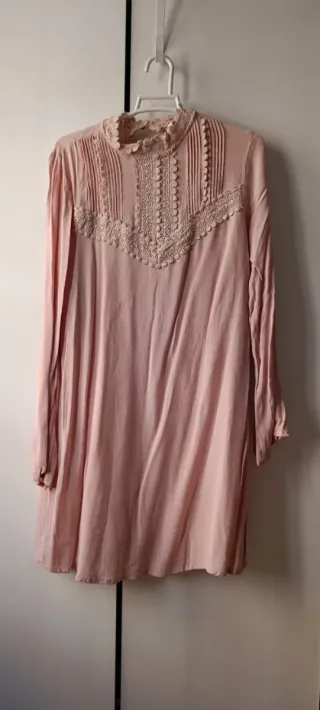 Vestido de estilo boho chic en tono rosa pastel, con detalles de encaje. - Diseño con encaje en el pecho y cuello. - Mangas largas. - Tejido ligero y trasparente con otro interior para que no sé trasparente. Tiene un poco descosida una manga, de ahí el precio (mira la última foto).
