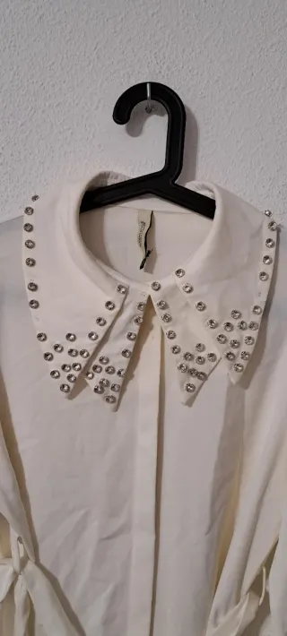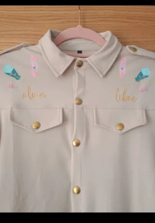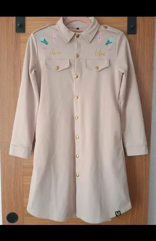 Vestido de corte recto con un diseño inspirado en la moda militar. Presenta detalles bordados y botones dorados. - Diseño con solapas y bolsillos en el pecho. - Bordado de plumas y texto alma libre en la parte superior. - Cierre de botones dorados en la parte frontal. - Mangas largas con puños abotonados. Marca española "El sueño de Lola" al estilo de Aire Retro. Talla XS un poquito amplia Sin etiquetas pero nunca usado.