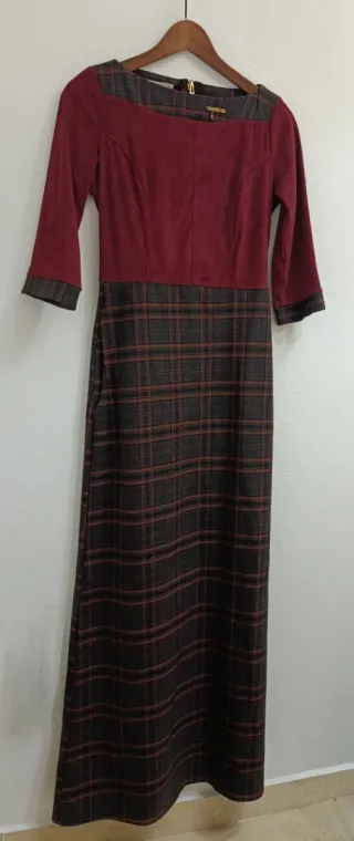 Precioso vestido maxi con falda de estampado de cuadros, un clásico que nunca pasa de moda. El cuerpo es burdeos con un tacto de antelina muy suave. Ideal para un look sofisticado de invierno u otoño. Detalles: Viene con cinturón, tiene bolsillos prácticos y cremallera dorada. Muy cómodo y con buena caída. Estado: Impecable, como nuevo. Talla: S (36). Medidas en plano: Largo: 140 cm Pecho: 43 cm Cintura: 35 cm Cadera: 44 cm Hombros: 34 cm Manga: 41 cm