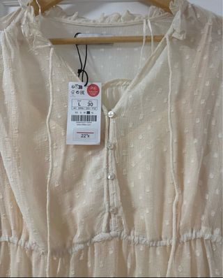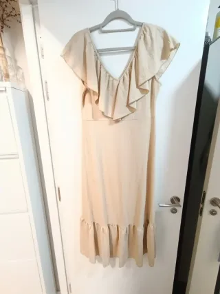 Precioso vestido midi de aire romántico y mediterráneo en color beige arena. Destaca por su escote en pico con un gran volante que continúa por los hombros y el bajo con acabado en volante. Estilo: Boho chic, ideal para eventos de verano o paseos por la playa. Corte: Ajustado a la cintura para favorecer la silueta y falda con vuelo. Estado: En excelente estado, tejido muy fresco y con una caída preciosa. Detalle: Tela con una textura ligera muy elegante. Vestido de Sfera talla M