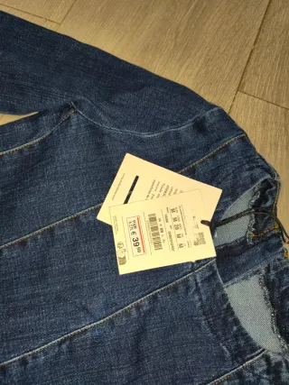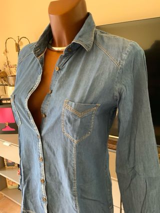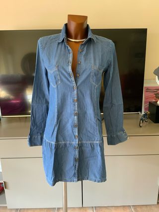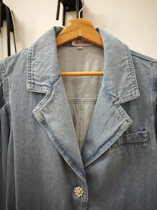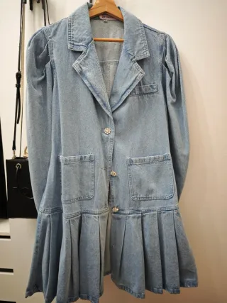 Vestido estilo blazer vaquero con un diseño moderno y juvenil. - Mangas abullonadas. - Detalle de volantes plisados en el bajo. - Dos bolsillos frontales. - Cierre de botones joya. - Solo me lo he puesto una vez.