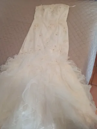 Elegante vestido de novia estilo sirena con detalles de encaje. Talla XL. Nuevo sin estrenar. Más cosas en mi perfil. - Diseño de corte sirena. - Adornado con delicado encaje. - Espalda con abertura. - Cola larga.