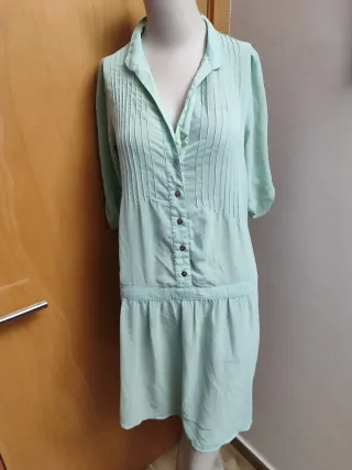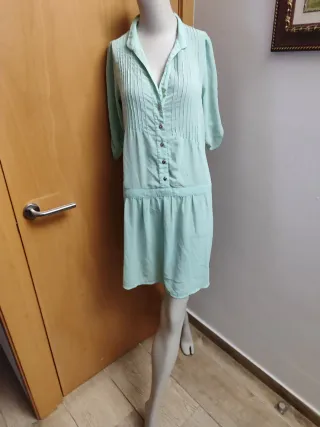 Vestido de estilo Cuple con un diseño elegante. - Color verde menta. - Cuello camisero. - Detalle de plisados en la parte delantera. - Cierre de botones. - Manga tres cuartos. - Falda con vuelo. Vestido Cuple talla S en muy buen estado