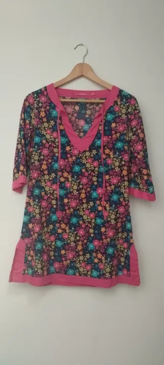 Túnica de playa de Women'secret. Talla 36. Vibrante estampado de flores sobre fondo oscuro y detalles en color rosa fucsia. Diseño: Escote en V pronunciado con cordones ajustables y ribete rosa. Mangas: Estilo 3/4 con bordes a juego. Tejido: Algodón ligero, fresco y transpirable, ideal para llevar sobre el biquini o como vestido corto informal. Medidas: De axila a axila: 45,5 cm. Largo total: 78 cm.