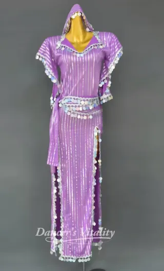 Vestido para danza oriental, estilo Raqs Sharqi. Diseñado para destacar en el escenario. - Diseño con rayas plateadas verticales. - Adornado con lentejuelas plateadas. - Aberturas laterales. - Incluye cinta para la cintura y otro para la cabeza.