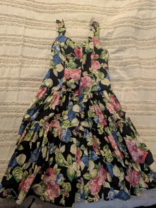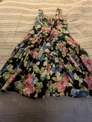 Espectacular vestido estilo pin up con un estampado floral vibrante. Diseño halter con cinturón negro. Se ajusta en la parte de atrás como un corsé. Estiliza y realza la figura. Ideal para una fiesta o evento. No pasarás inadvertida. Nunca se utilizó, está con etiqueta y la bolsa original. La guia de tallas está en la última fotografía. - Escote corazón. - Falda con vuelo. - Cierre de lazo en el cuello.