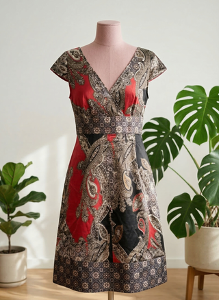 Vestido súper favorecedor con estampado paisley y tacto de seda. Queda increíble puesto gracias al escote cruzado y la caída de la falda. de largo mide aproximadamente 102 cm Marca: Easy wear Talla 40 en etiqueta, pero talla pequeño. Por sus medidas (44 cm de sisa y 38 cm de cintura), recomiendo para una talla 38 (M) o una 36 (S) que quiera que le quede con caída.