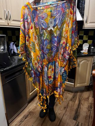 Vestido original de Antica Sartoria, estilo boho/ibicenco, con precioso estampado floral multicolor sobre fondo amarillo. ✔ Talla L/XL (queda suelto y cómodo). ✔ Tejido ligero y fresco, ideal para verano, playa o vacaciones. ✔ Detalles muy bonitos con borlas decorativas en el bajo y mangas. ✔ Cintura ajustable con cordón. ✔ Nuevo con etiqueta. ✔️Diseño suelto y vaporoso ✔️ Detalle de flecos en los bajos. Es un vestido muy vistoso y alegre, perfecto para llevar con sandalias, alpargatas y suecos.
