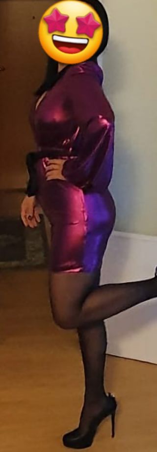 vestido con tejido brillante, elástico, muy adaptable al cuerpo y con una abertura en la zona del estómago. Lleva una sombreas pronunciadas dando un estilo de años 80.