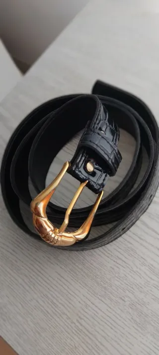 Elegante cinturón vintage con textura de piel de cocodrilo (faux leather) en color negro brillante. Lo más destacado es su hebilla metálica en color oro, con un diseño artístico y ergonómico que le da un toque muy sofisticado y único (estilo años 80/90). Es el accesorio perfecto para elevar un look básico de jeans o para marcar la cintura sobre un vestido o blazer. #animalprint #croco #crocodilestyle #efectococodrilo #hebilladorada #goldbuckle