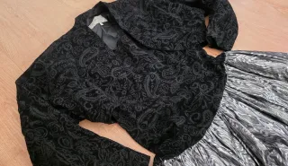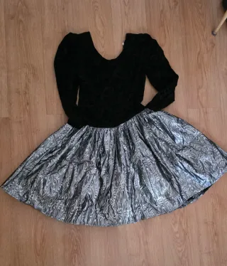 Vestido de fiesta vintage con un estilo inspirado en los años 80. Combina un cuerpo negro con una falda plateada brillante. -Cuerpo elastico - Cuerpo de terciopelo con relieve. - Falda con acabado metalizado y estampado. - Mangas largas abullonadas. - Lleva can can incorporado
