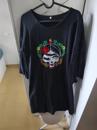 Vestido negro con un diseño bordado de Frida Kahlo. - Diseño de calavera mexicana con flores. - Mangas con detalle. - Estilo único y llamativo.