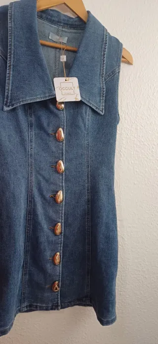 Vestido vaquero de corte moderno, ideal para un estilo casual. Ideal ahora para el veranito. - Diseño sin mangas. - Cierre frontal con botones dorados. - Cuello camisero. - Costuras marcadas.