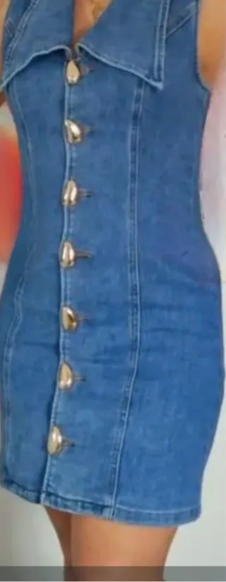 Vestido de estilo camaleónico con un diseño moderno.vaquero elastico pvp 155e - Confeccionado en tela vaquera. - Detalle de volantes en la falda. - Cierre de botones en la parte frontal.