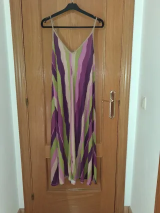 Vestido largo en tonos morados y verdes con rayas diagonales, ideal para ocasiones veraniegas o estilo bohemio casual. Estilo/corte: Largo fluido con tirantes finos y escote en V. Talla: Única, de 38 a 46. Medidas aprox.: Largo 130 cm, pecho/cintura 90-110 cm Estado: Muy buen estado, usado pocas veces, sin manchas ni rotos .#vestido #vestidolargo #rayas #modavintage #bohochic #summerdress #maxidress #stripeddress #fashion #bohostyle #robe #robeLongue #rayures #modeboheme #vestefemme