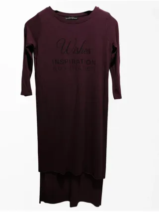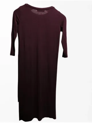 Vestido midi de manga larga en perfectísimo estado. - Marca Bershka - Talla XS - Color Burdeos - Manga 3/4 - Estampado Wishes Inspiration No Imitation. - Bajo asimétrico de doble capa,con aberturas laterales (ver penúltima foto) Estilo informal y cómodo,ideal para combinar con vaqueros ajustados o leggins,para un look diario. 95% Modal (*Explicación en última foto) 5% Elastano Medidas en las fotos Visita mi perfil 👀 y encontrarás una gran variedad de prendas 👗👕👖🧥 y de calzado 👟 de distintas tallas a precios 💰 económicos!!