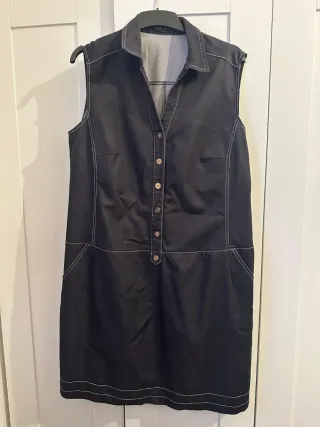 Vendo vestido elegante e increíblemente cómodo en color azul marino profundo, confeccionado en un tejido ligero y transpirable. Es la mejor opción para los días de calor. Características principales: • Perfecto para viajar: Ocupa muy poco espacio en la maleta y se seca rápidamente. • Gracias al diseño del cuello, no es necesario añadir accesorios adicionales; el look ya luce completo. • Silueta recta y holgada con hombros ligeramente caídos. El cinturón permite acentuar la cintura según se prefiera. • Color: Azul noche (Night Blue) Talla: S • Estilo: Casual • Estado: Muy bueno Es una prenda que luce noble, minimalista y sofisticada