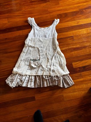 Vestido blanco de la marca Ian Mosh, con un diseño delicado y detalles bordados. - Estilo bohemio. - Tejido ligero. - Detalle de volantes en el bajo. - Lazos para ajustar en la cintura.
