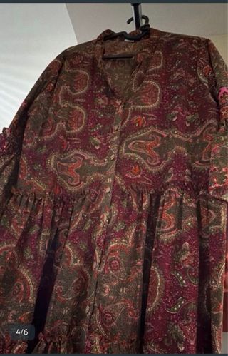 Vestido estilo caftán de Zara, ideal para la playa o para un look casual. Sin estrenar. - Estampado paisley en tonos verdes. - Manga larga abullonada. - Cuello con escote en V y detalle de lazada. - Largo midi.