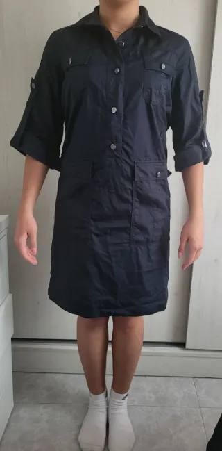 Vestido azul marino de estilo camisa, ideal para un look casual. - Manga 3/4 con opción de remangarse. - Dos bolsillos en el pecho. - Bolsillos de parche en la parte delantera. - Cierre de botones.