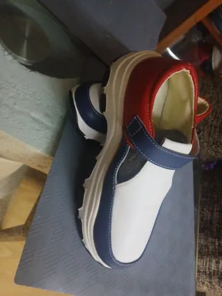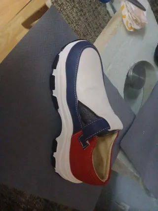 Zapatos casuales con un diseño moderno y cómodo. - Combinación de colores blanco, azul y rojo. - Suela gruesa y resistente. - Estilo slip-on para mayor facilidad.