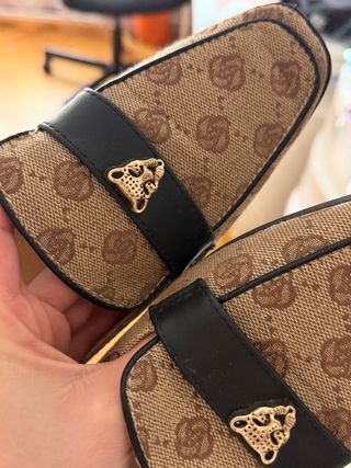 Mocasines estilo Gucci estampado – Talla 35 Preciosos mocasines de estilo clásico con estampado tipo monograma en tonos beige y marrón. Llevan detalle metálico dorado con cabeza de leopardo en la parte delantera y banda negra que les da un toque elegante. ✔️ Talla: 35 pero dan muuuucha talla ✔️ Color: beige/marrón con detalle negro ✔️ Suela: negra, cómoda y resistente ✔️ Estado: en buen estado, con leves marcas de uso en el interior (ver fotos) Son muy cómodos y fáciles de combinar, ideales para looks casuales o más arreglados. 💫 Perfectos para vaqueros, vestidos o pantalones de vestir.