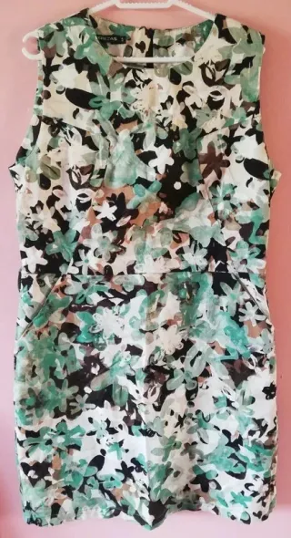 Vestido con un vibrante estampado de estilo mandala y hojas. - Diseño sin mangas. - Cuello alto tipo bufanda. - Detalle de botones en la parte frontal. Nuevo sin estrenar y de tacto muy agradable. Tengo más vestidos en el escaparate...