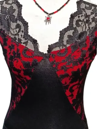 Vestido gótico de la marca Spiral Direct, en negro con encaje y estampado rojo. Diseño muy favorecedor con escote de encaje y falda con vuelo. El contraste entre el rojo intenso y el encaje negro lo hace muy llamativo y elegante. Medidas • Axilas: 46 cm • Hombros: 40 cm • Cintura: 38 cm • Largo: 76 cm Talla S (equivale aprox. a 36-38). Tela elástica que se adapta bien al cuerpo. Muy cómodo y favorecedor. Marca muy conocida dentro del estilo goth / alternative / rock. Usado solo dos veces. #gothic #vestidogotico #spiraldirect #alternativestyle #rockstyle #gothfashion #darkwear #vestidorock #rock #gothdress