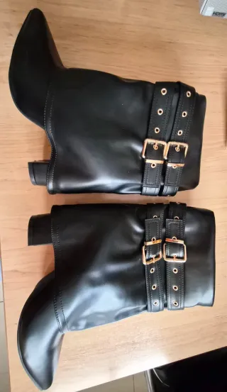 Vendo estas espectaculares botas de caña media en color negro. Tienen un diseño muy actual con doblez tipo "fold-over" y detalle de doble hebilla dorada que les da un toque muy chic y sofisticado. Estado: Totalmente nuevas, nunca se han usado (ver foto de la suela). Color: Negro mate con herrajes dorados. Estilo: Ideales tanto para un look casual con jeans como para algo más arreglado con falda o vestido. Tacón: Tacón ancho de 10 cm muy estable Talla: 41 Las vendo porque [me quedan pequeñas / fue un regalo y no es mi estilo], pero están impecables. ¡Una oportunidad perfecta!