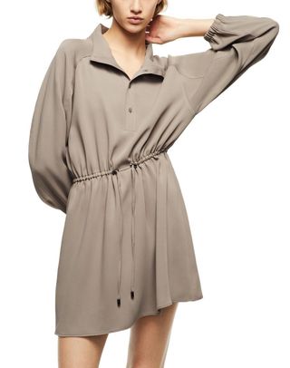 Vestido oversize de Zara, talla XS. Estilo fluido camisero, viene con cuello de chimenea y botones en el pecho, y se puede ajustar en la cintura. Se vende porque me queda muy grande. Costó 29,95 €. Es un color entre gris topo y beige. Manga larga con gomas en puños. De axila a axila 48 cm y de largo 84 cm.