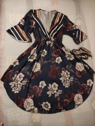 Vestido vaporoso de tejido ligero con estampado floral, muy fluido y femenino, ideal para primavera y verano. Detalles del producto: • Talla M–L. • Tejido ligero y semitransparente. • Escote en pico. • Mangas amplias con caída. • Bajo redondeado, más largo en los laterales. • Incluye cinta independiente para ajustar la cintura, a juego con el vestido. • Largo por debajo de la rodilla. • Estilo boho / casual. • En muy buen estado.