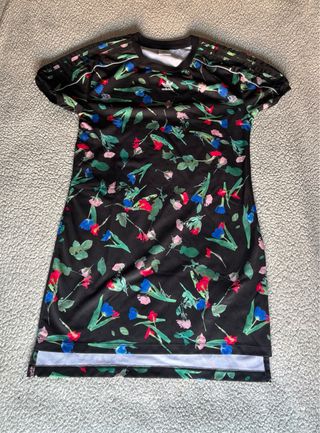 Vestido estilo camiseta para mujer de manga corta que destaca por su llamativo estampado floral integral sobre un fondo negro. Presenta un estampado de flores vibrantes en tonos azules, rojos y verdes. El corte es holgado y casual, similar al de una camiseta de gran tamaño (oversized). Tiene cuello redondo, mangas cortas y un dobladillo con aberturas laterales para mayor comodidad y estilo. Recoger en zona de Congosto en Villa de Vallecas. Hago envíos.