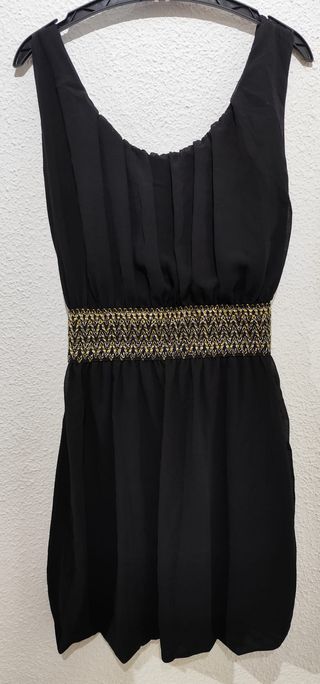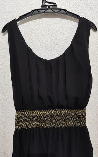 Vestido negro unitalla, amplio y muy elástico, diseñado para adaptarse cómodamente a diferentes tipos de cuerpo. Cuenta con escote amplio, tirantes anchos y cintura elástica con detalle bordado en dorado que aporta un toque elegante. Su falda suelta y de caída ligera lo hace ideal para ocasiones casuales o eventos especiales, combinando comodidad y estilo en una sola prenda.