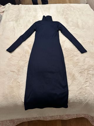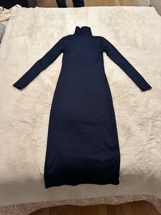 ✨ **Vestido midi azul marino de cuello alto** ✨ Vestido ajustado de punto canalé en color azul marino, con cuello alto y manga larga. Corte entallado que estiliza la figura y tejido elástico muy cómodo que se adapta al cuerpo. Ideal para otoño e invierno, perfecto tanto para looks casual con botas como para ocasiones más elegantes con tacones.