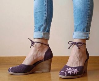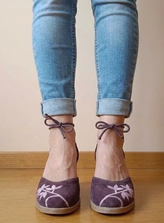 Alpargatas de cuña de Zara con un bonito bordado floral. - Material de pana. - Cierre con lazada al tobillo. - Diseño con bordado floral en la puntera. -Tacón: Cuña de 7 cm. -Fabricación: Hechas en España. Quedan espectaculares con unos vaqueros cropped (como en las fotos) para un look casual, o con vestidos midi de flores para un estilo más boho-chic. Son el zapato perfecto para la transición de primavera o para noches de verano.