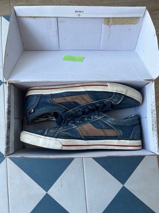 Zapatos de estilo casual de la marca Lois Jeans. - Diseño en tela vaquera azul. - Detalles en tono marrón. - Suela blanca con detalles rojos.
