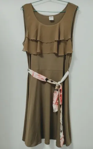 ▪️ Vestido colores r Caqui sin mangas. ▪️Escote redondo ▪️Talla XL ( dá más talla) ▪️Tiene dos volantes en el escote, de seda. ▪️Tela de gran caída. ▪️Presillas en la cintura para cinturón o pañuelo anudado. ▪️Estilo Midi, altura por la rodilla ▪️Estilo casual ▪️Puesto en dos ocasiones. #vestido #vestidomidi #vestidoseda #vestidoviscosa #vestidoverde #sinmangas #primavera #verano #primaveraverano #xl #tallaxl #vestidoxl